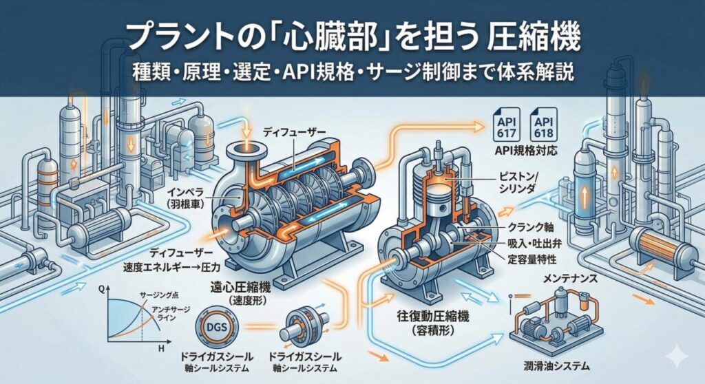 はじめに:プラントの「心臓部」を担う圧縮機 石油精製・石油化学・天然ガス処理・アンモニア合成・LNGプラントなど、あらゆるプロセスプラントにおいて、圧縮機(コンプレッサー)はポンプと並ぶ最重要回転機械です。ポンプが液体を送り出すのに対し、圧... AI