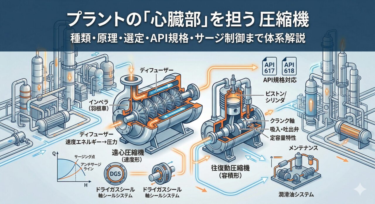 プラントの規模や処理するガスの種類によって、圧縮機の方式・容量・設計仕様は大きく異なります。適切な機種選定を誤ると、設備コストの増大や運転効率の低下だけでなく、サージングや振動といった運転トラブルに繋がります。本記事では、プラントで使用される主要な圧縮機の種類・作動原理・選定基準から、API規格対応、サージング・シール・潤滑油システムの技術詳細、そしてメンテナンスの要点まで体系的に解説します。
